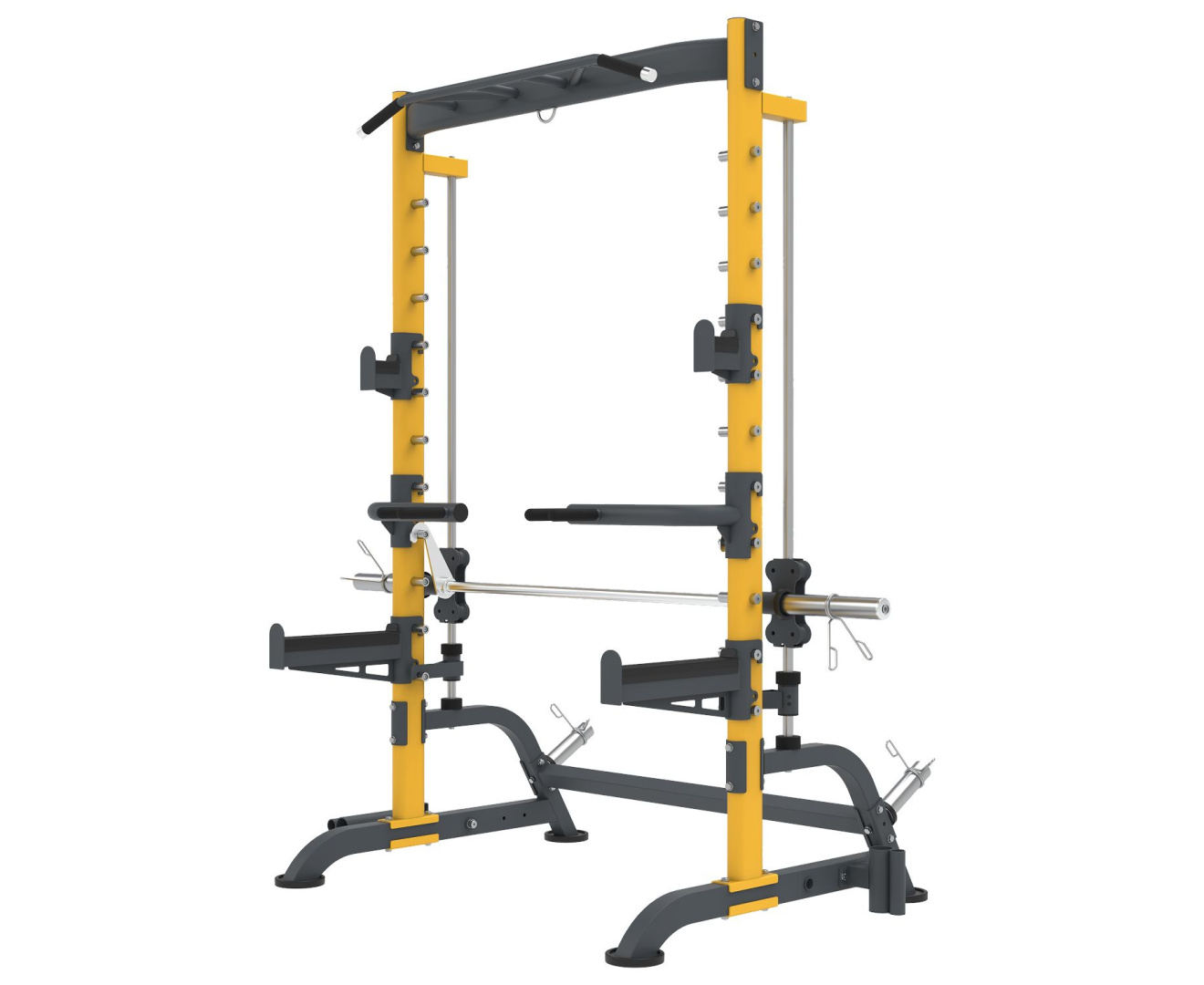 Машина Смита представляет собой силовой тренажёр с прочной стальной рамой, выполненной в жёлто-чёрной цветовой гамме. Конструкция имеет устойчивую П-образную форму и оснащена двумя основными вертикальными направляющими, по которым перемещается фиксированный гриф. По всей высоте стоек расположено множество уровней фиксации, позволяющих точно настраивать рабочую высоту штанги под различные упражнения и рост пользователя.