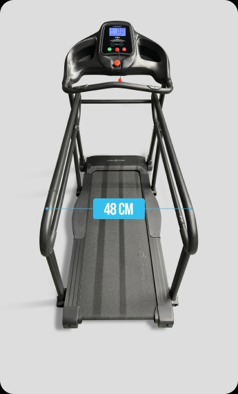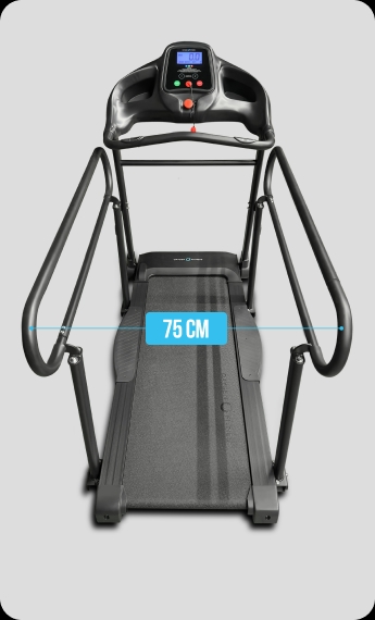 Так, Revive B построена вокруг принципа двойной опоры. Нижний поручень расположен на высоте 60 см от бегового полотна — именно такой уровень позволяет уверенно опираться пользователям с низким ростом, детям или пациентам, проходящим ранние этапы реабилитации. Верхняя перекладина находится на уровне 80 см — это классическая точка поддержки для взрослого пользователя. Поручни могут быть установлены в двух вариантах. В первом случае они располагаются ближе к телу — расстояние между ними составляет 48 см, что создаёт эффект плотной фиксации корпуса. Второй вариант — внешняя установка с расстоянием 75 см между поручнями, когда опора используется как страховочная, без прижатия к корпусу. Это позволяет адаптировать дорожку под текущие физические возможности конкретного человека, не меняя оборудования.