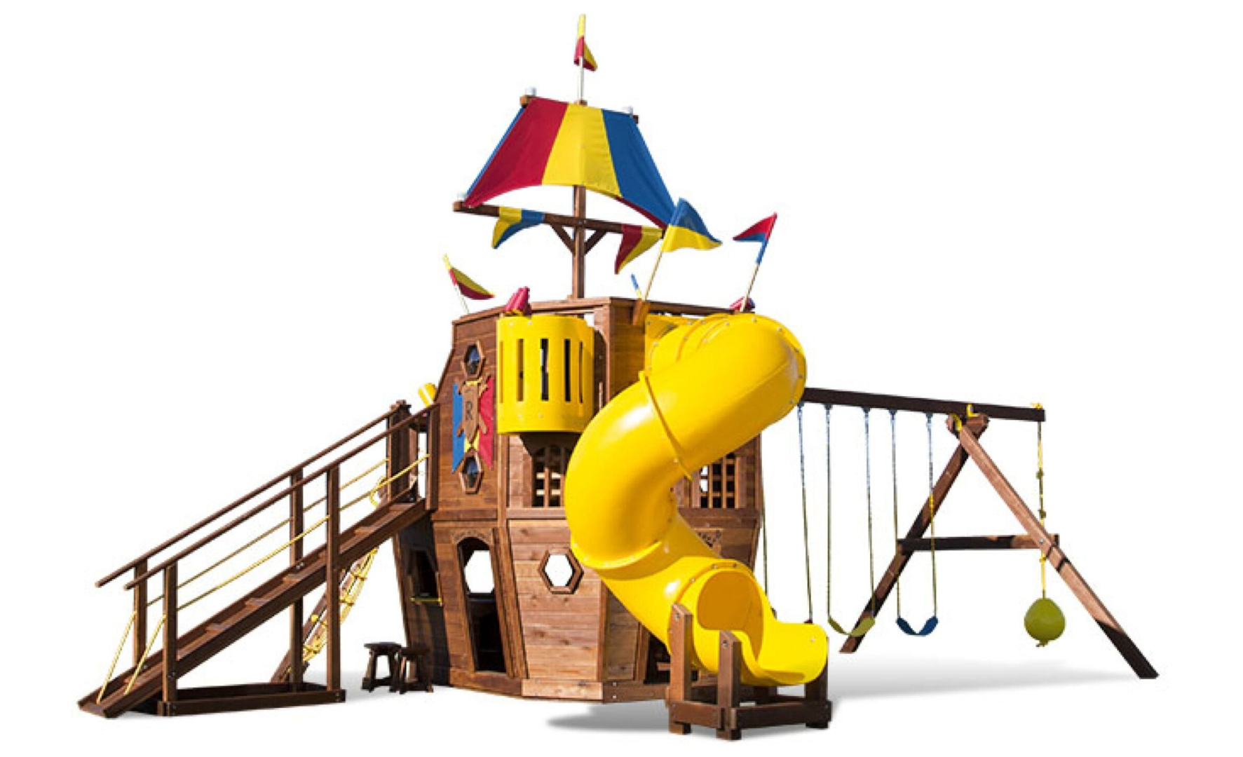 Цельный брус американского и канадского кедра, прошедший десятиступенчатую термообработку фирменными влагоустойчивыми антисептиками. Пластик первой категории качества, нетоксичный, не имеет неприятного запаха и полностью безопасен для детей. Металлические цепи покрыты винилом в местах, где ребёнок может схватить их руками. Бинокли, телескопы и другие аксессуары детализированы и также сделаны из прочного пластика.